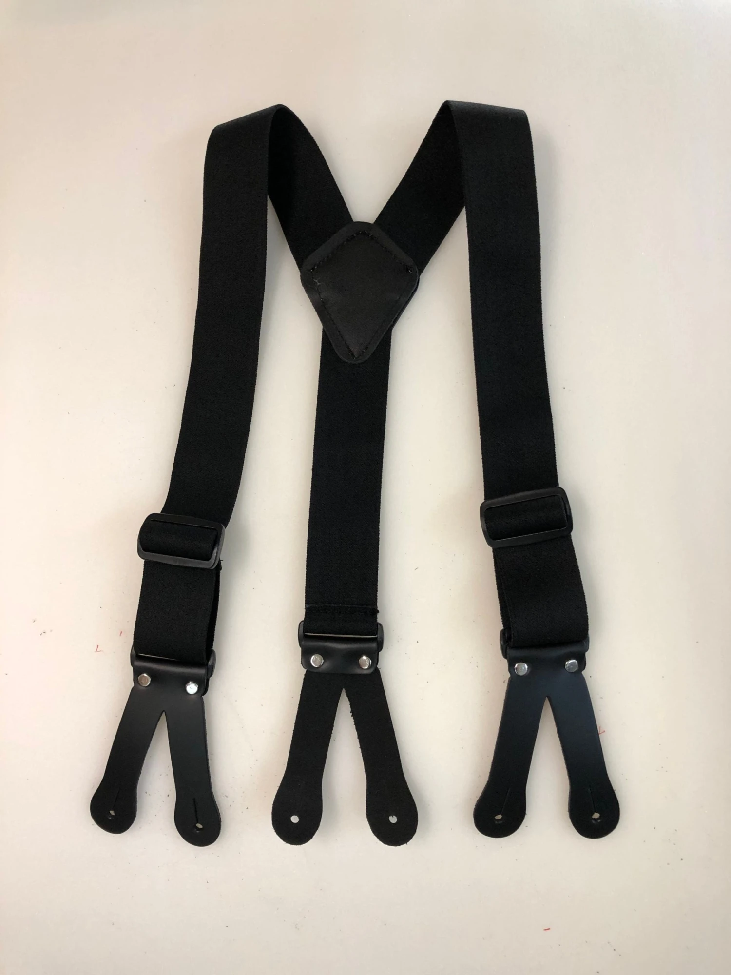These Logger Suspenders are made of 1 1/2 ” wide heavy duty elastic. Non-slip slides and loops of Acetol and 6 oz. leather button on ends are combined with our durable heavy duty elastic. Made in either the X-BACK or Y-BACK (shown). Leather button ends are available along with the loop back. For accurate sizing, measure from right front to left back